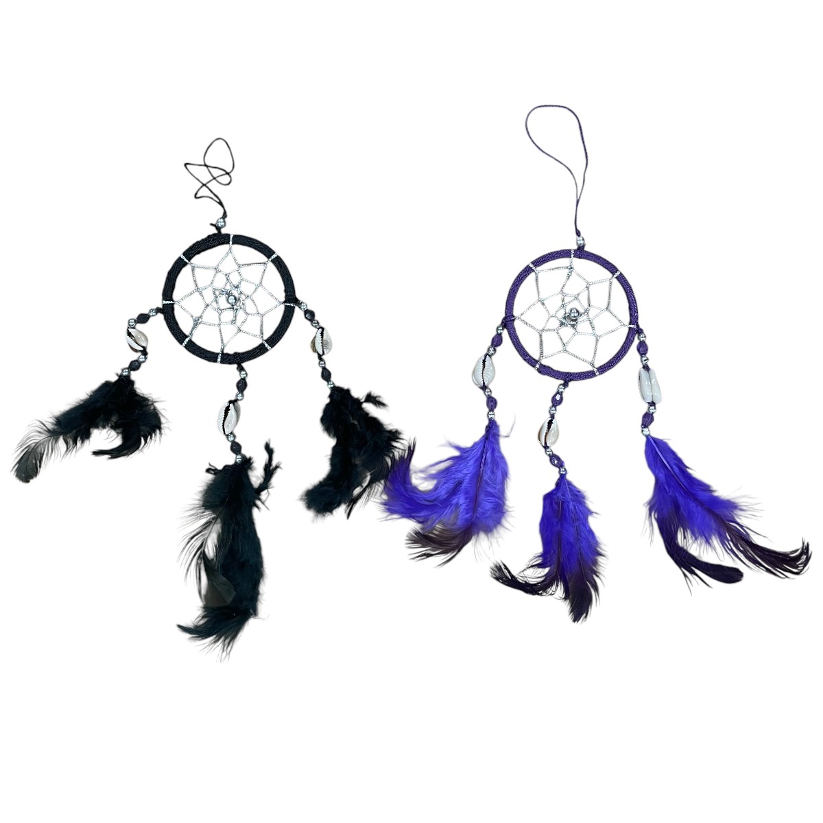 Miniature dreamcatchers with feather tassels. Assorted colours; white, black, turquoise, brown, purple and pink.