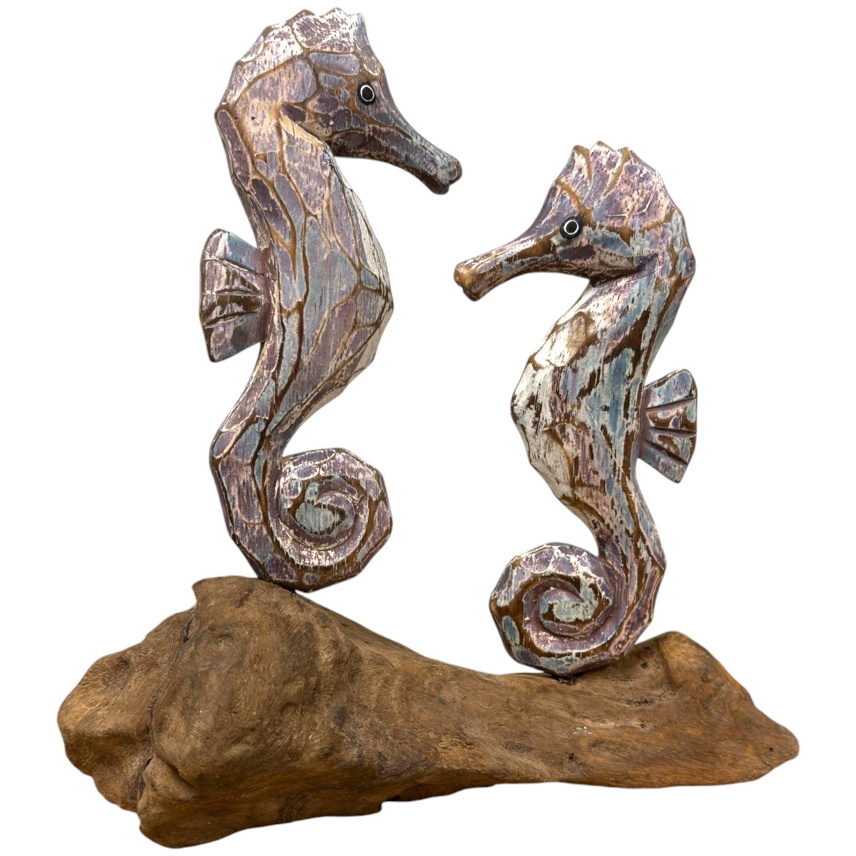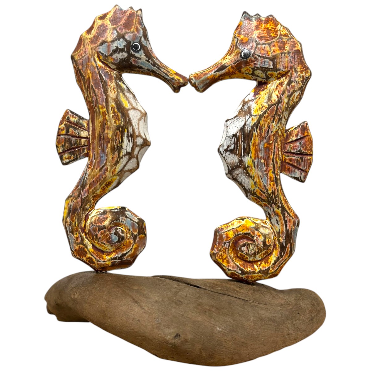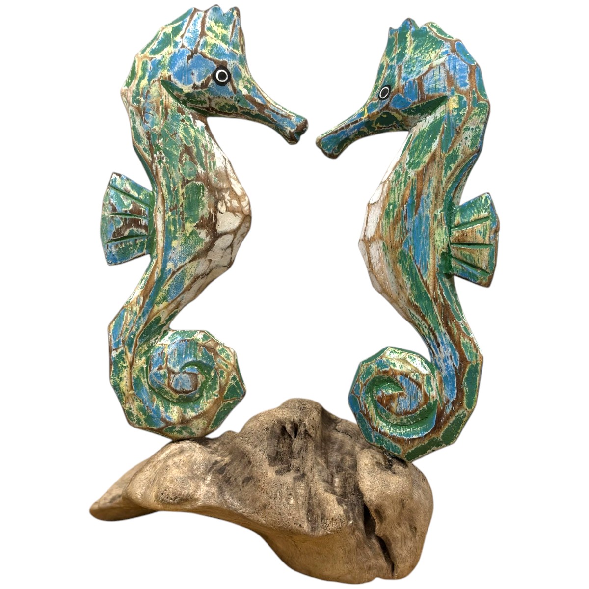 Hand-carved and hand-painted albesia wood double painted seahorses on root.