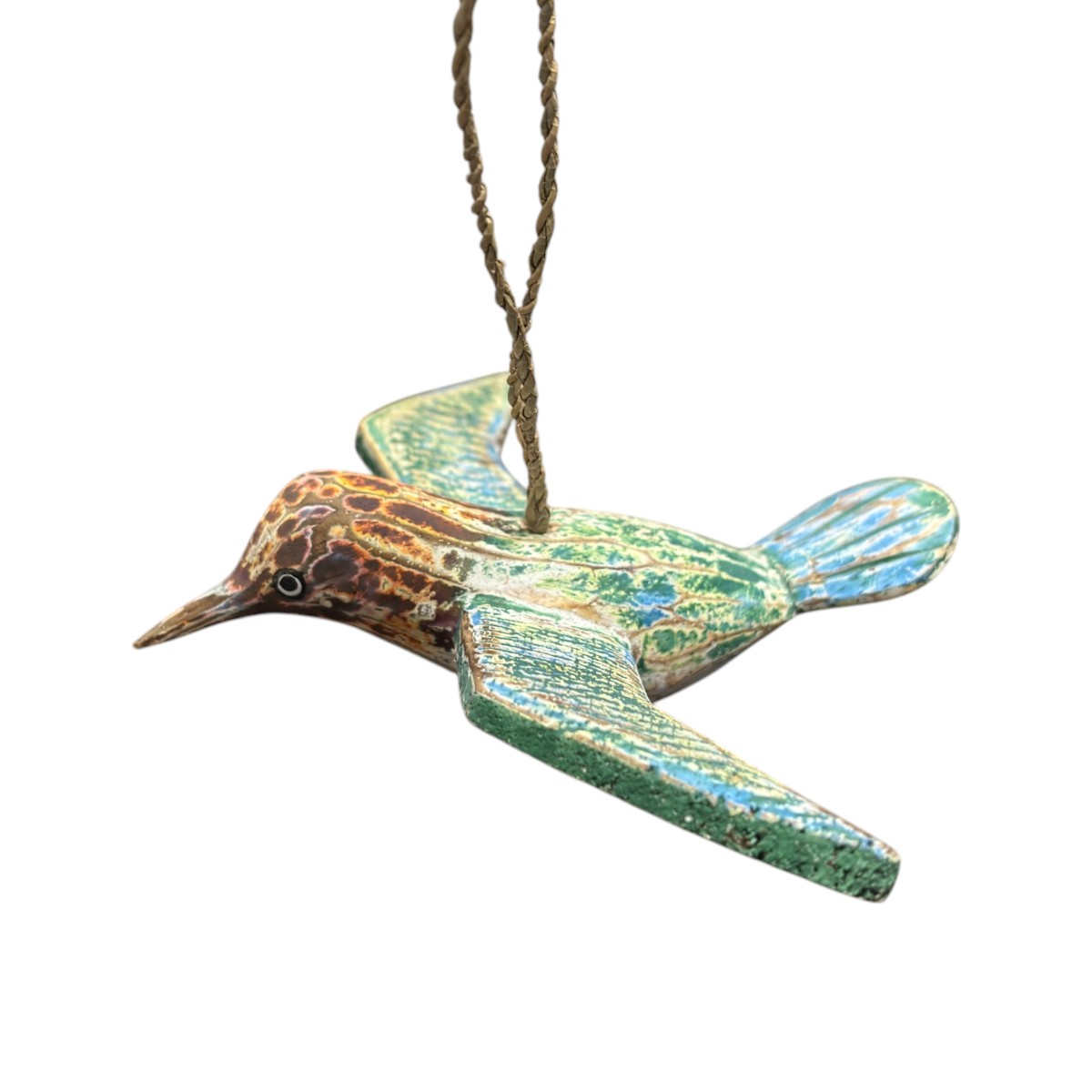 Hand-carved and hand-painted albesia wood abstract bird on string.