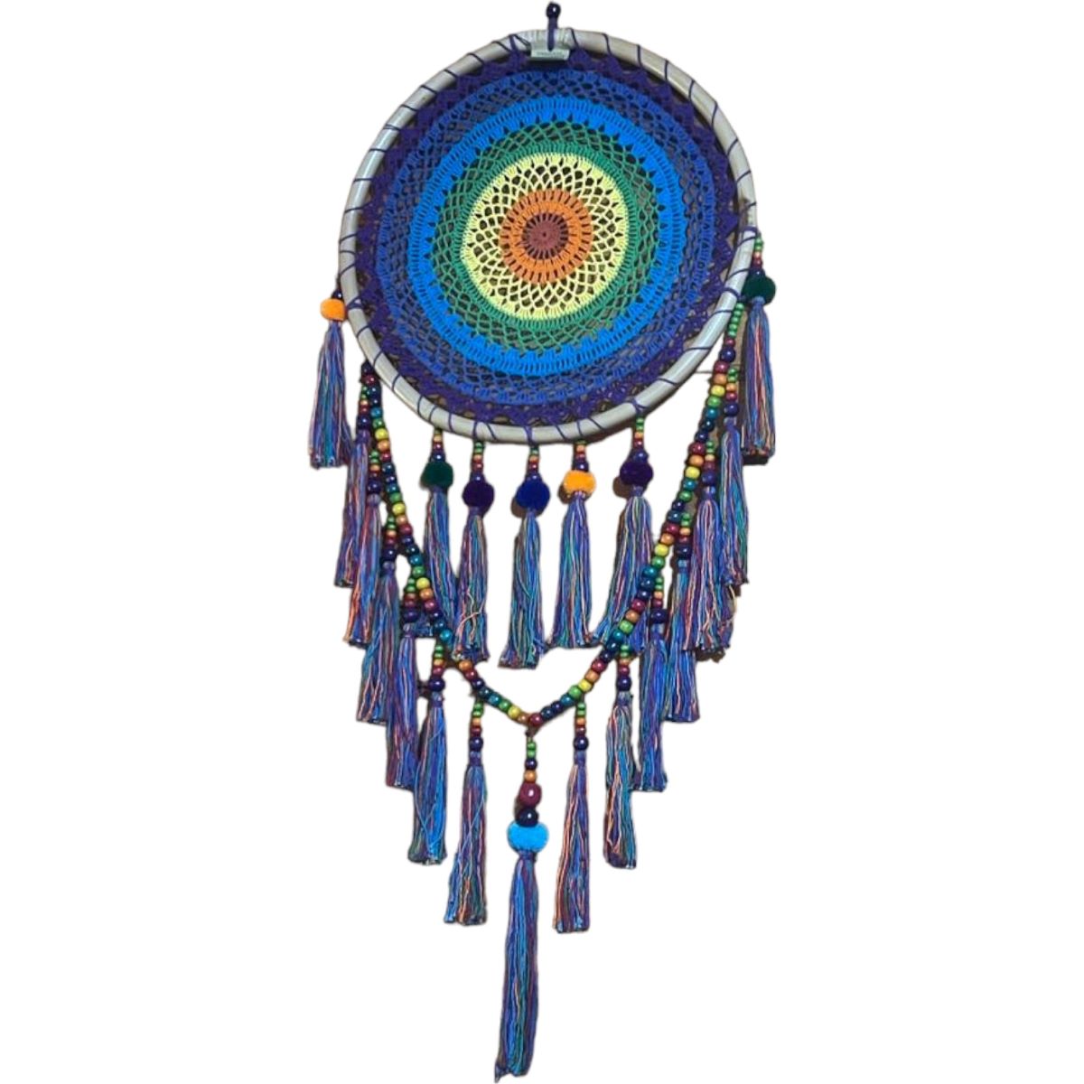 Macrame rainbow dreamcatcher with pompoms and tassels.