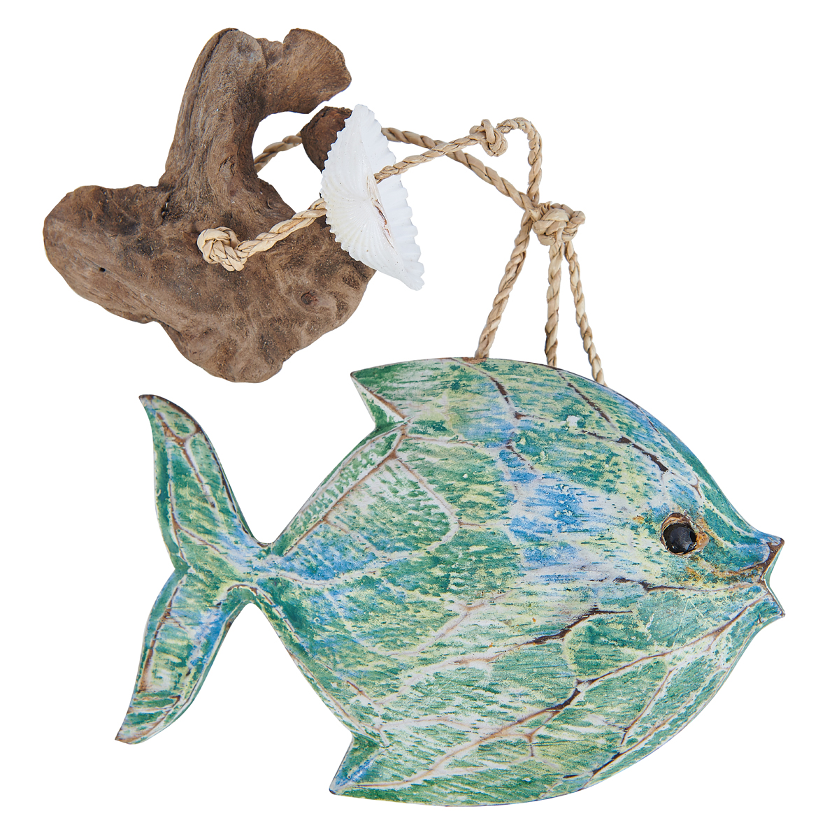 Hand carved and hand-painted driftwood fish mobile in different colours.