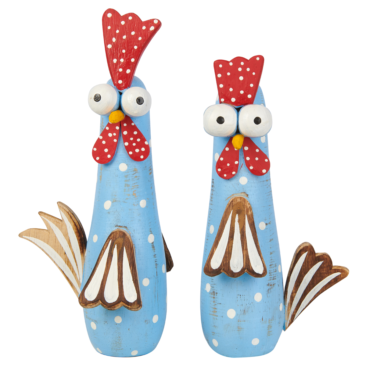Hand-carved and hand-painted albesia wood set of two skittle cartoon chicken.