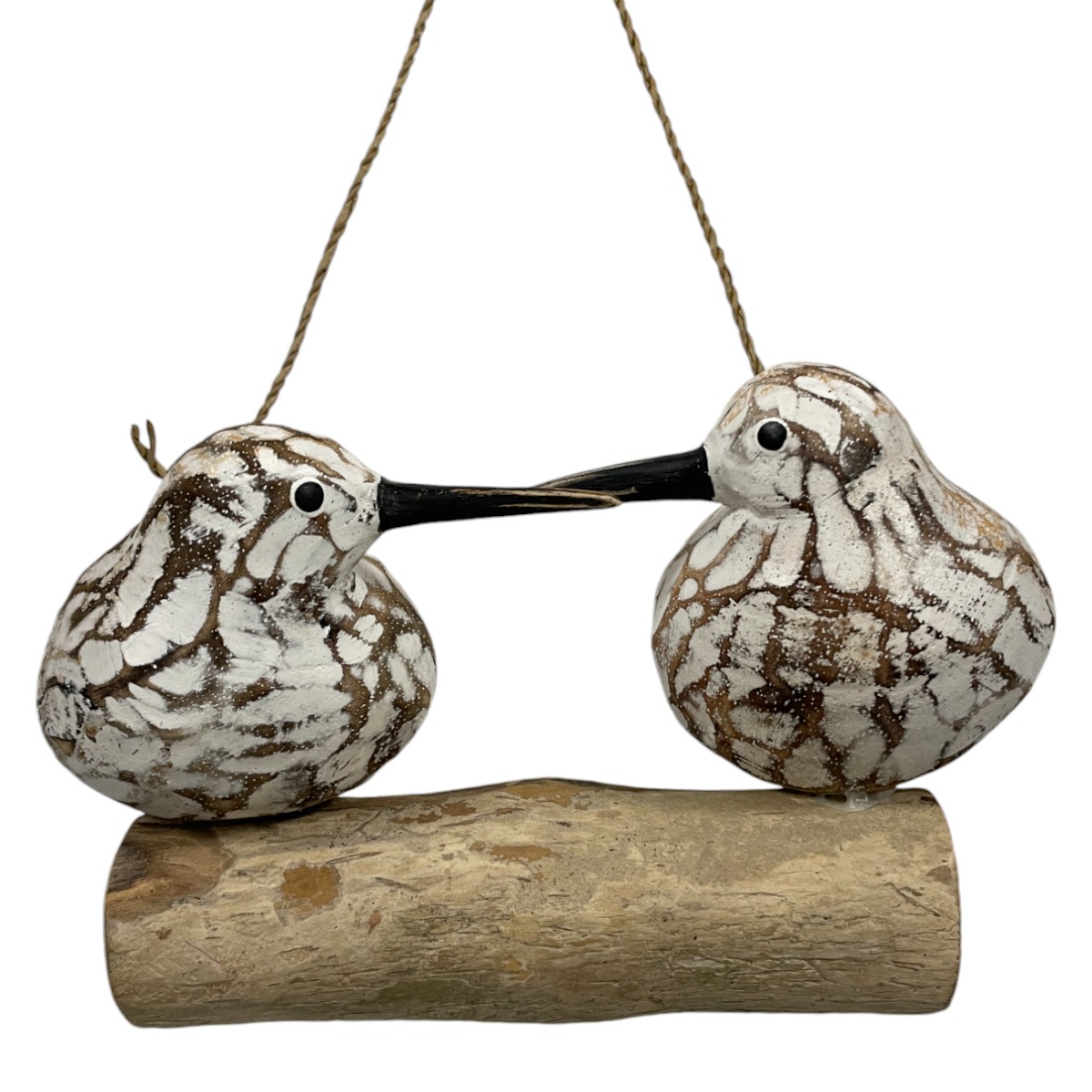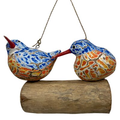 Hand carved and hand-painted wooden abstract birds on a swing. Assorted colours.