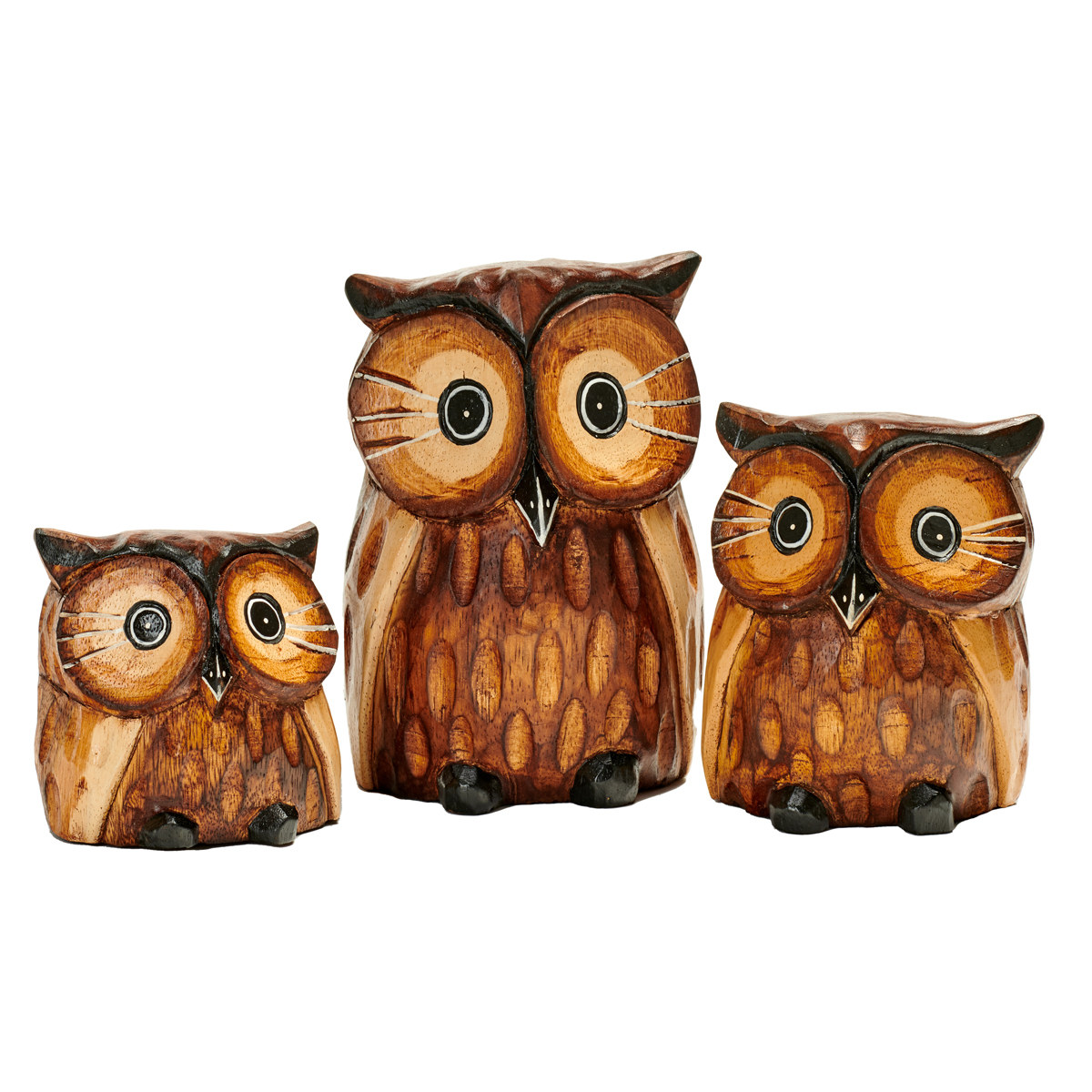 Hand-carved and hand-painted albesia wood set of 3 owls with etched feathers.