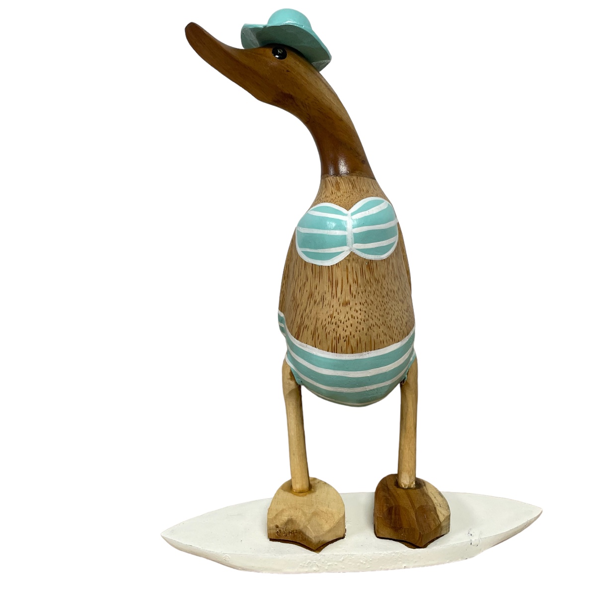 Hand- carved and hand-painted and varnished bamboo root and teak female duck on a surfboard.