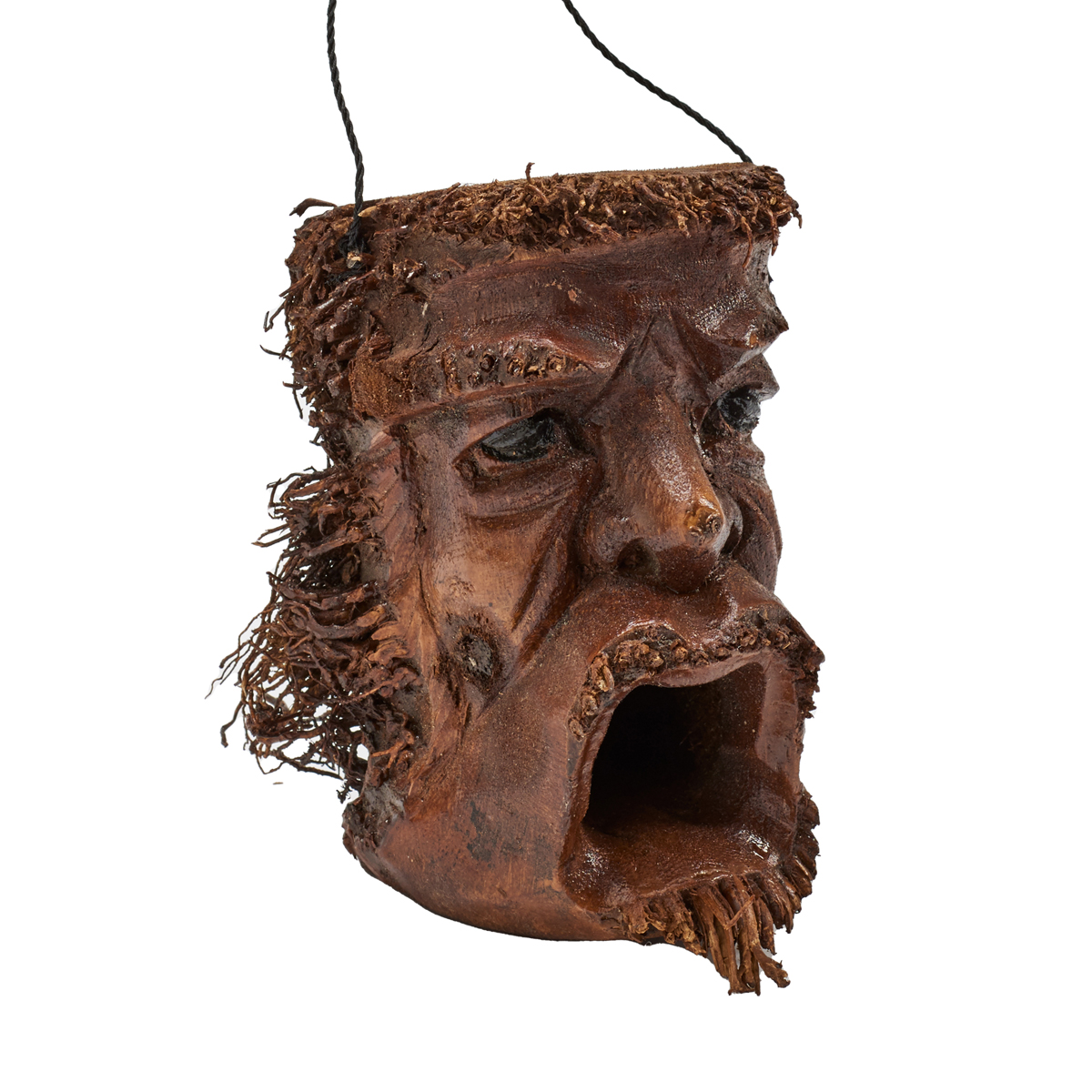 Bird house hand-carved from bamboo root and varnished. Suitable for outdoor use.