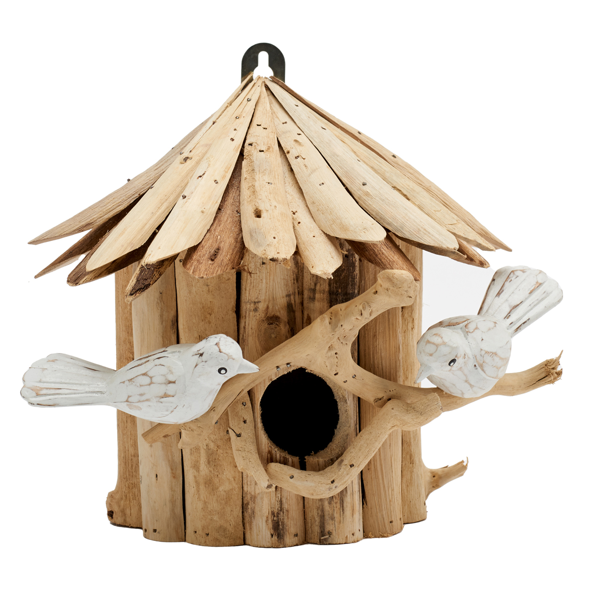 Flat back bird house for outside wall mounting with bird decoration. Made from driftwood. Dimensions; H20cm.