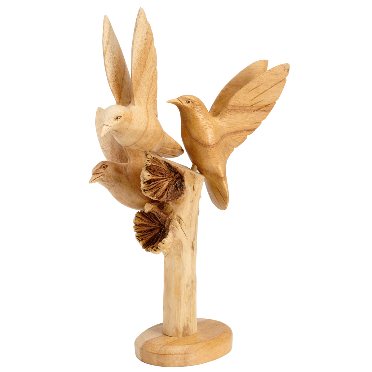 Family of three birds hand-carved from jempinis wood on parasite wood stand. Parasite wood is a mushroom-like growth that feeds from the Chinaberry (Jempinis) tree embedding itself into its bark.