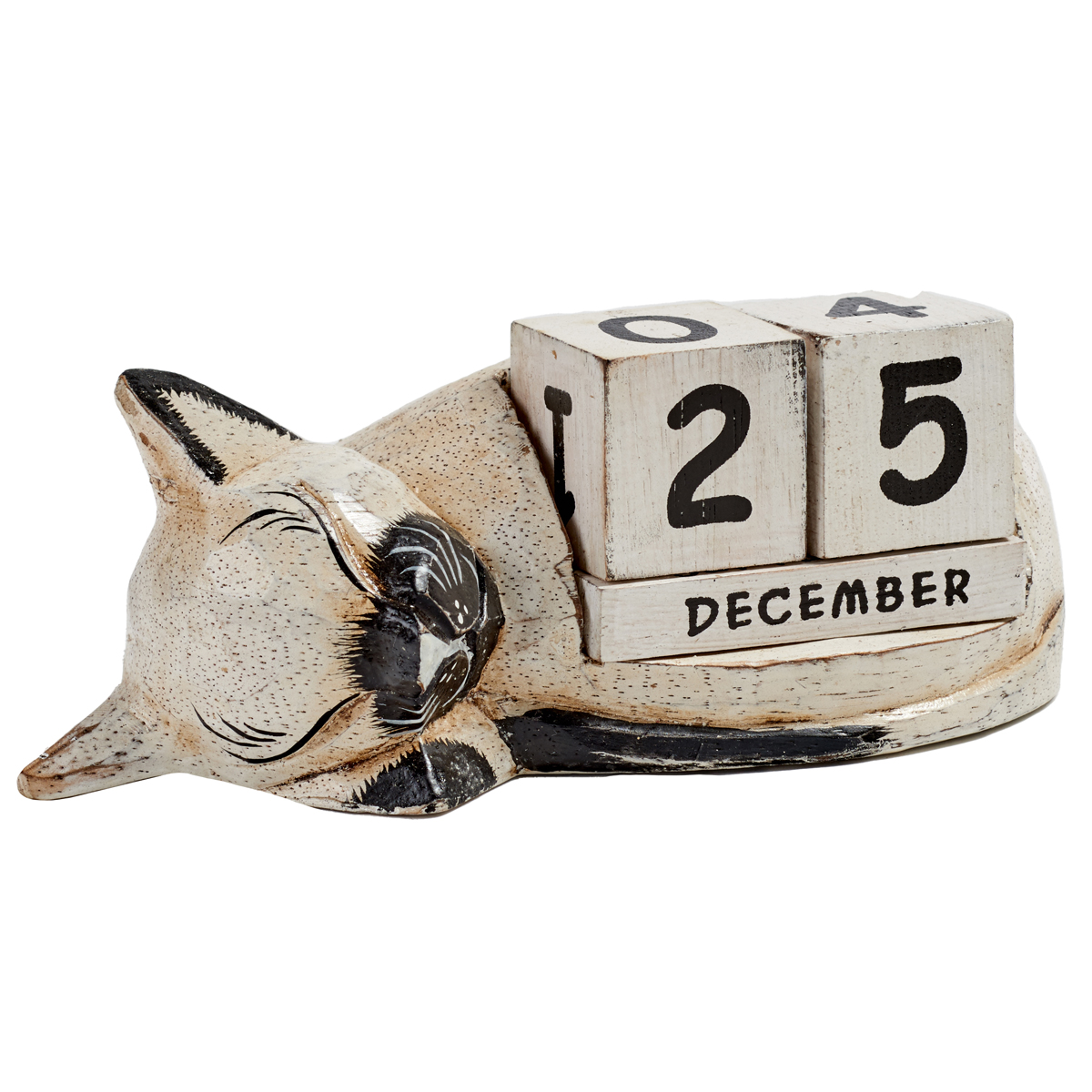 Hand-carved and hand-painted albesia wood sleeping cat block calendar.