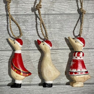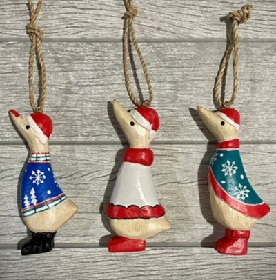 Hand-carved and hand-painted albesia wood christmas tree decoration painted ducks.
