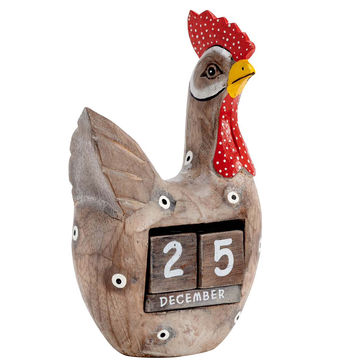 Hand-carved and hand-painted albesia wood hen block calendar.
