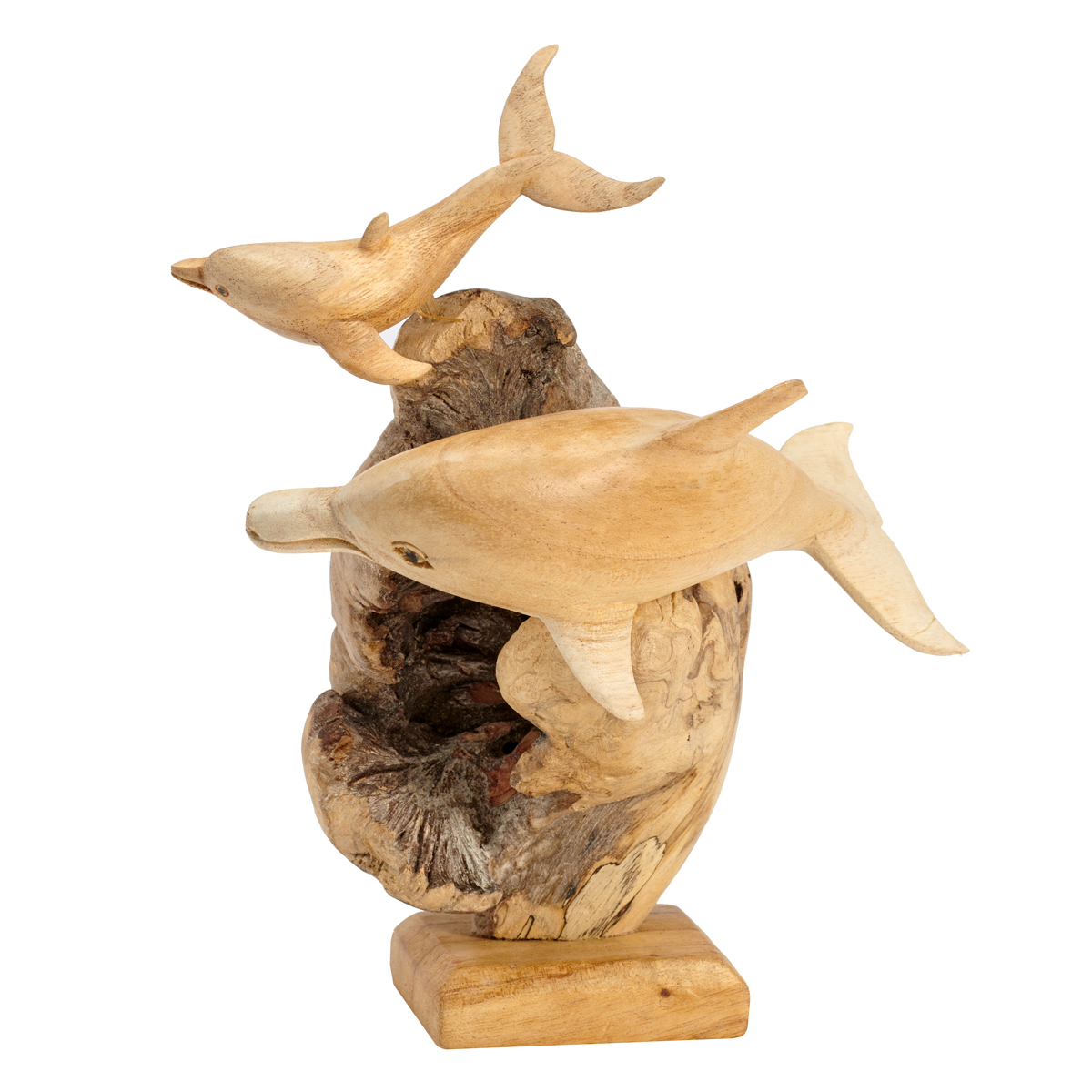 Double dolphin hand-carved from jempinis wood on parasite wood coral. Parasite wood is a mushroom-like growth that feeds from the Chinaberry (Jempinis) tree embedding itself into its bark.