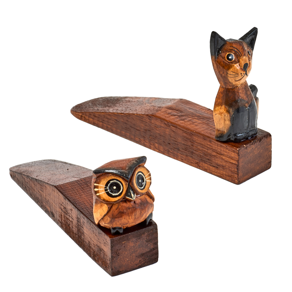 Hand-carved and hand-painted albesia wood animal doorstop.