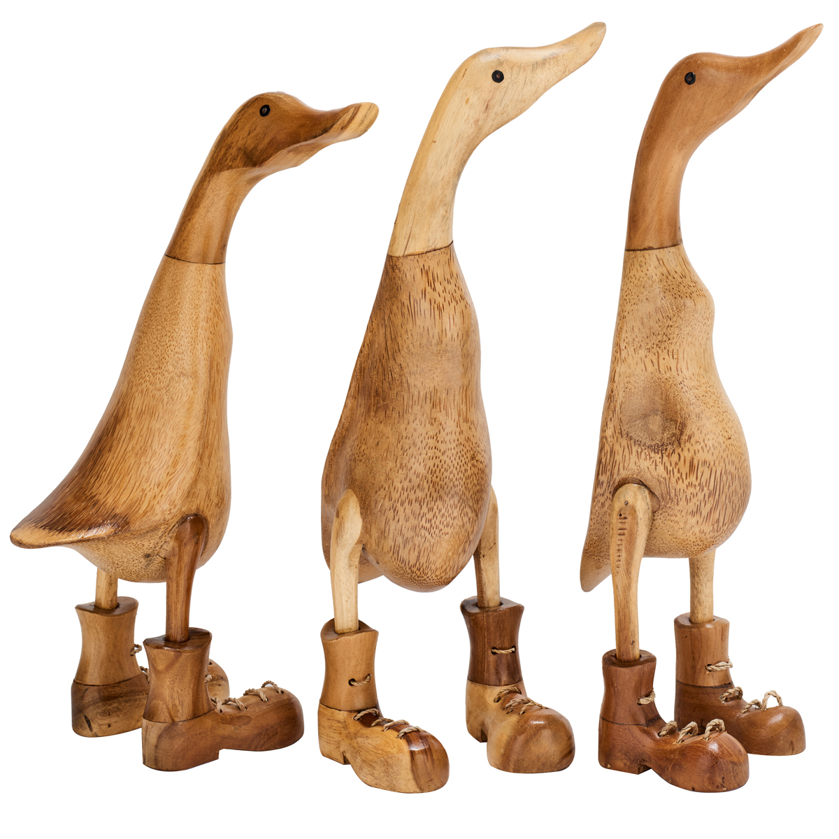 Hand-carved bamboo root and teak duck with boots looking in various directions. This item has been varnished so is suitable for house or garden decoration.