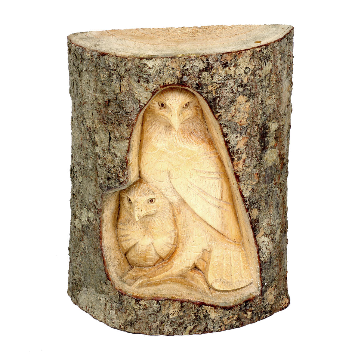 Hand-carved jempinis wood owl and chick in tree trunk.