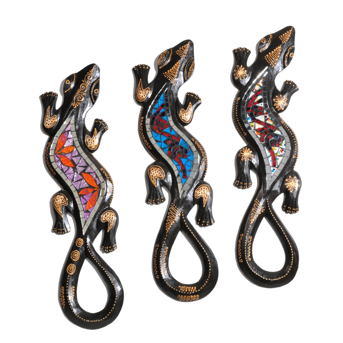 Hand-carved and hand-painted albesia wood gecko wall art with mosaic inlay.