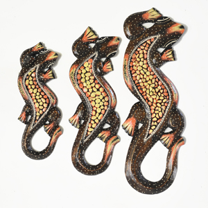 Hand-carved and hand-painted albesia wood set of 3 geckos with stone inlay.