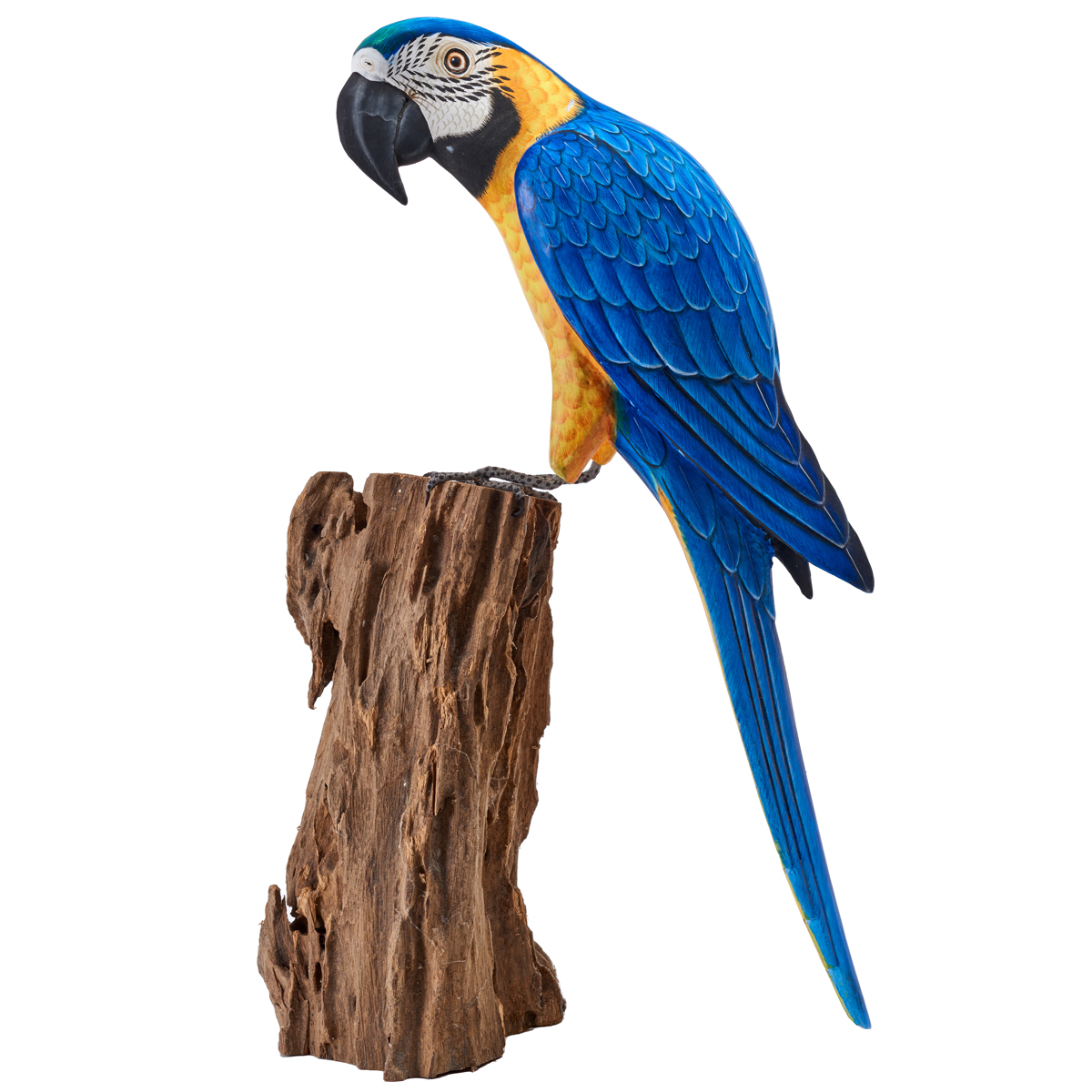 Hand-carved and hand-painted albescia wood Macaw on a driftwood stump.