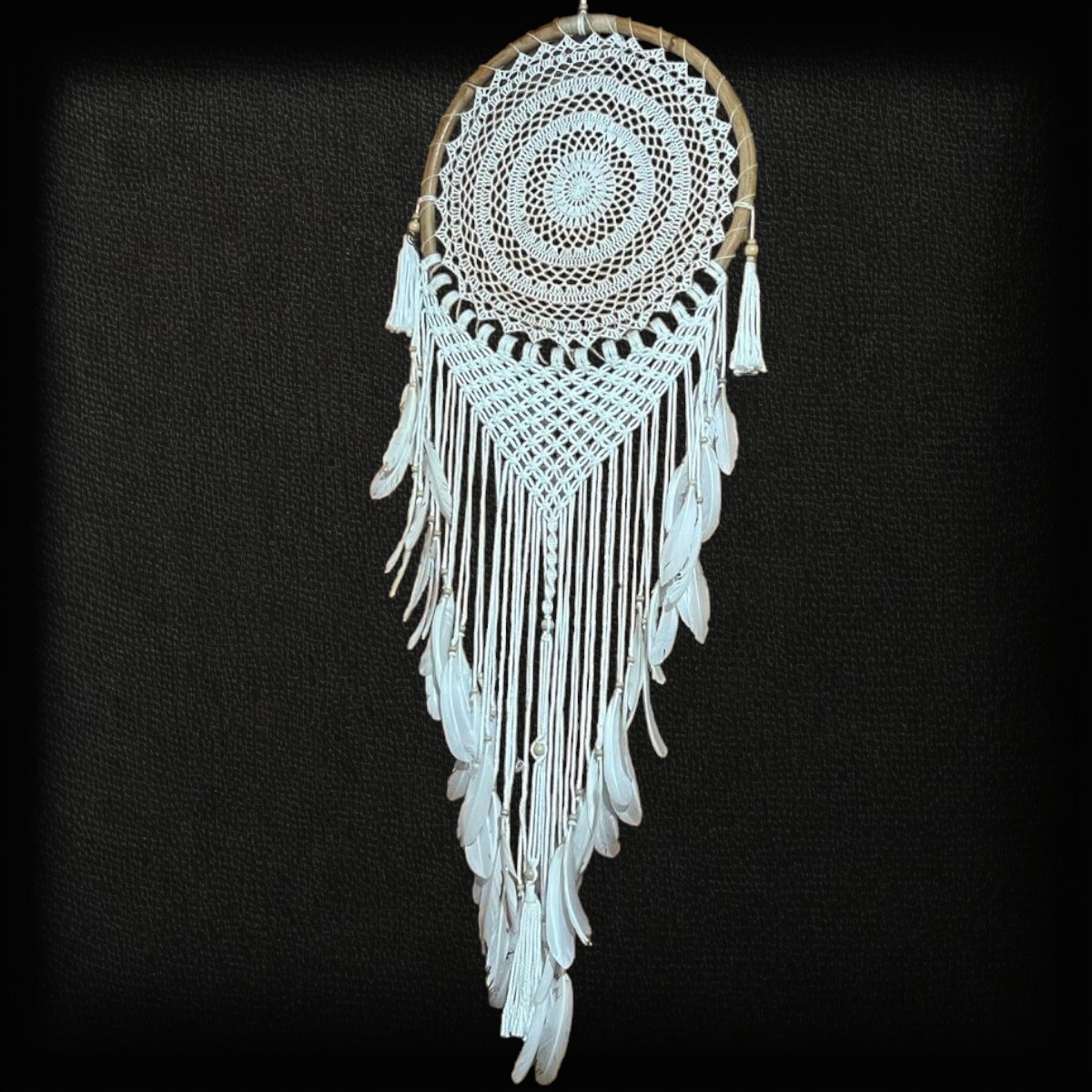Macrame dreamcatcher with rattan frame and feather tassels.