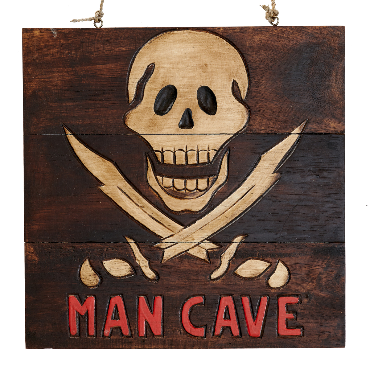 Hand carved and hand-painted skull and swords ‘man cave’ wooden sign.