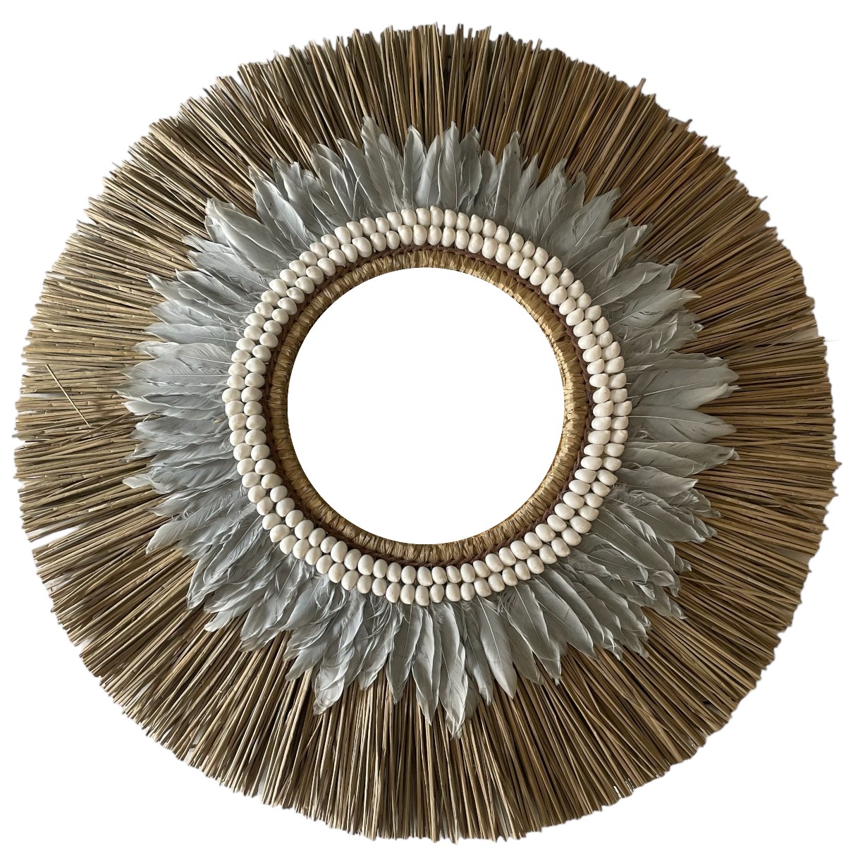Mendong mirror with bead and feather decoration.
