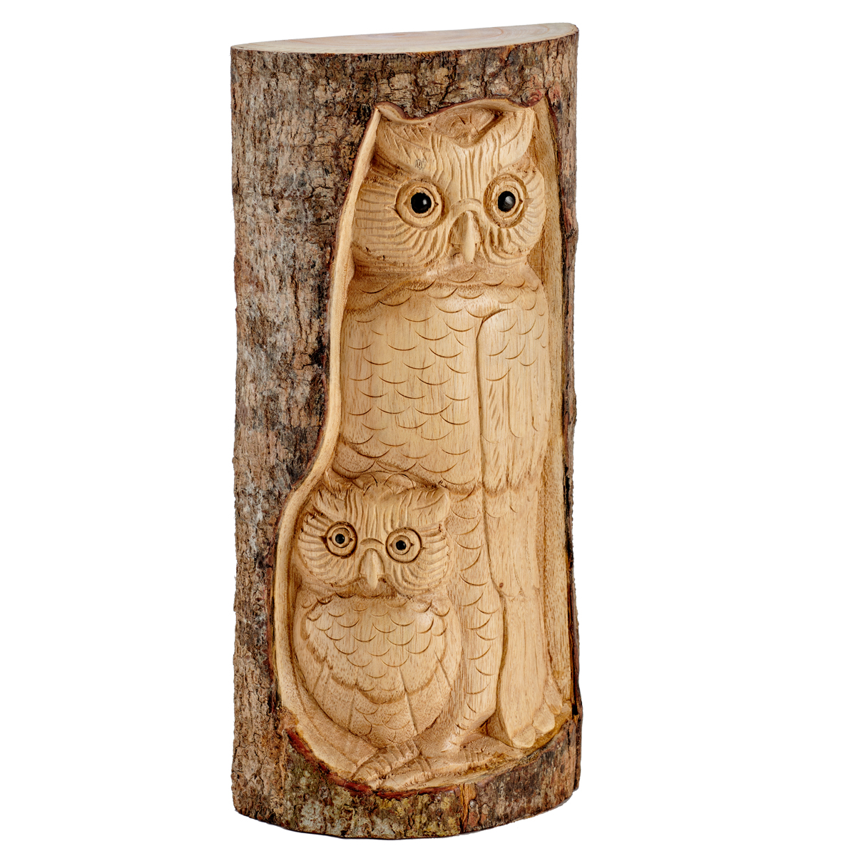Hand-carved jempinis wood owl and chick carved in tree trunk.