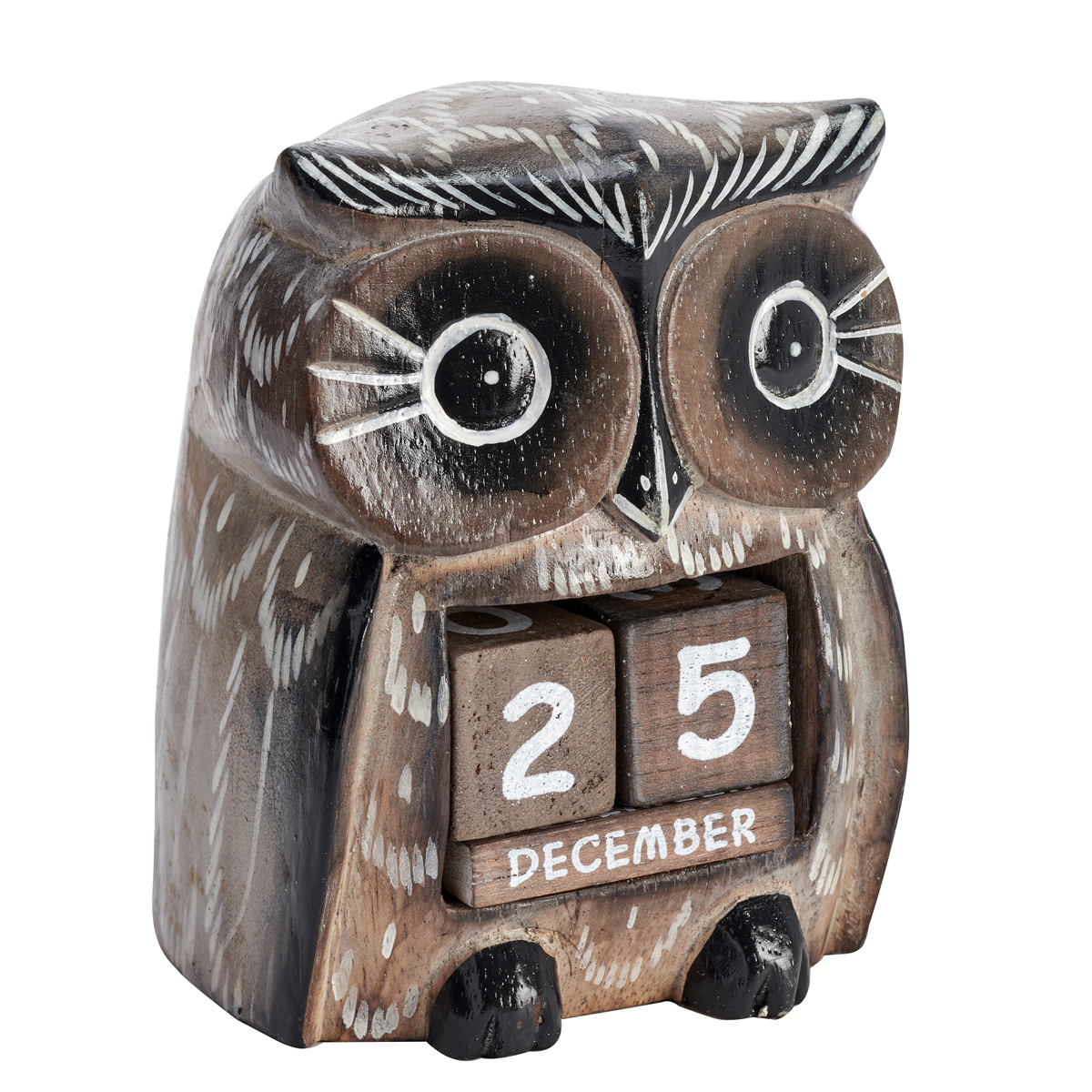 Hand-carved and hand-painted albesia wood owl block calendar.