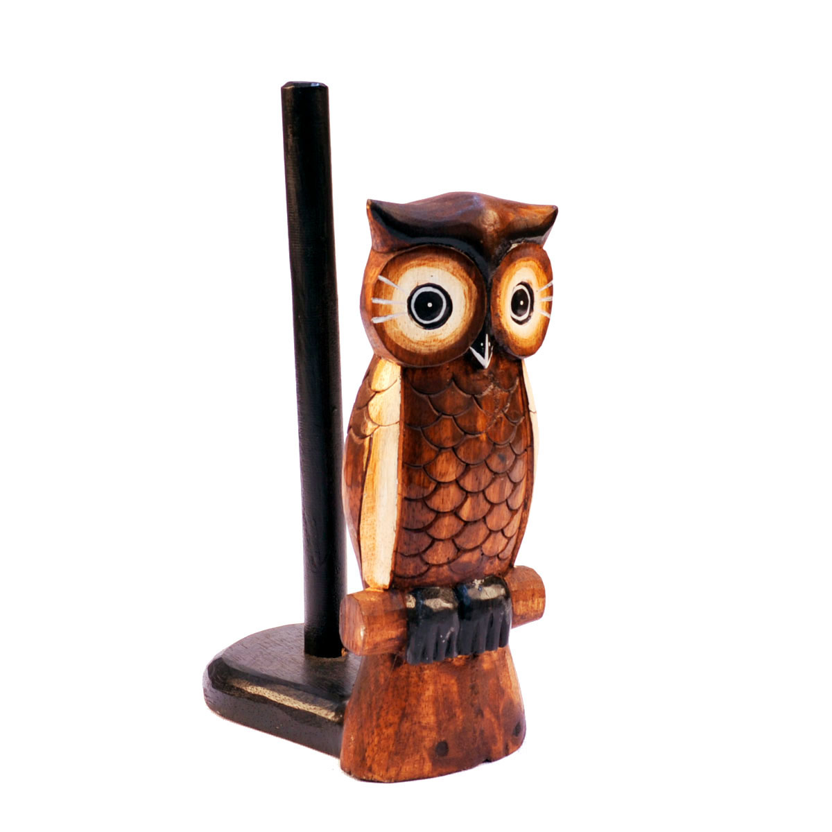 Hand-carved and hand-painted albesia wood owl kitchen or toilet roll holder.