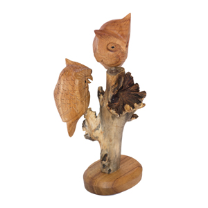 Two owls hand-carved from jempinis wood on a parasite wood. Parasite wood is a mushroom-like growth that feeds from the Chinaberry (Jempinis) tree embedding itself into its bark.
