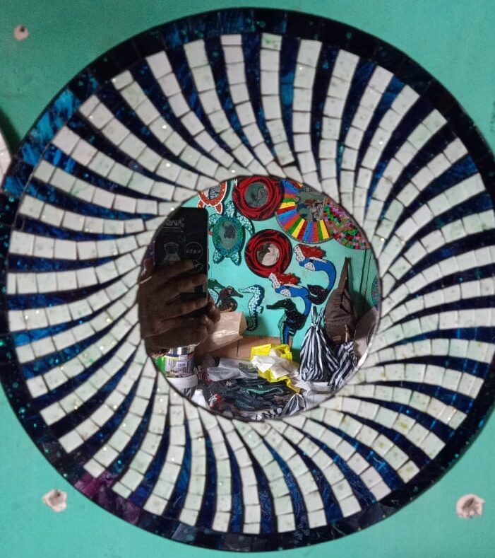 Round mosaic turbine motif mirror.