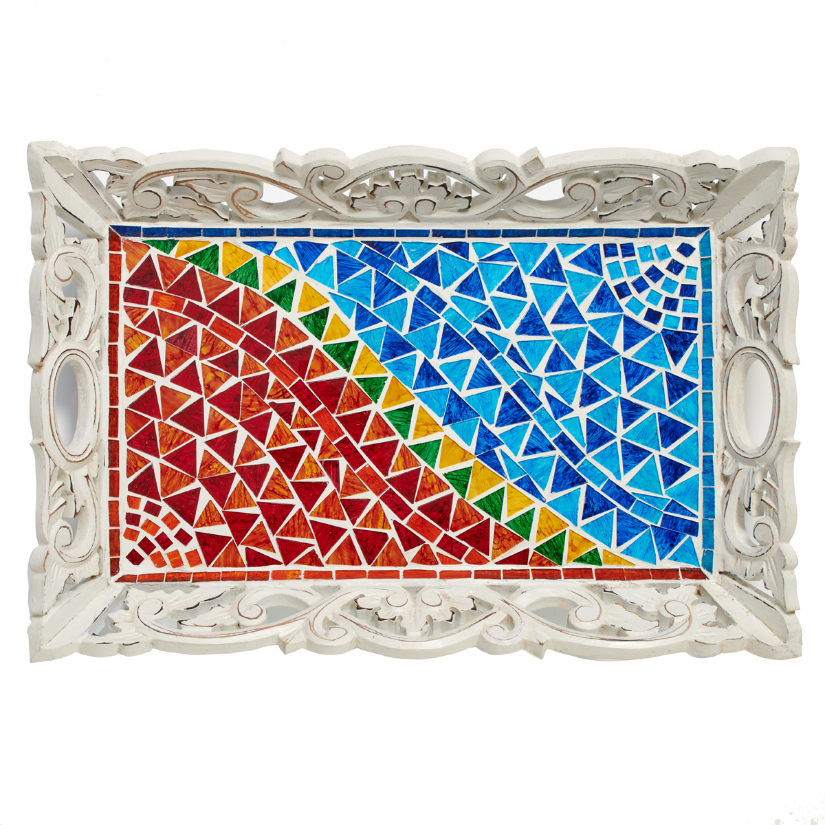 Set of 3 carved wooden trays with mosaic inlay. Dimensions; L48 x W32cm, L40 x W30cm, L36 x W26cm.