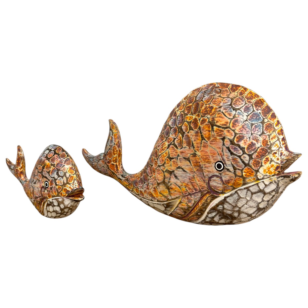 Hand-carved and hand-painted albesia wood set of two painted whales.