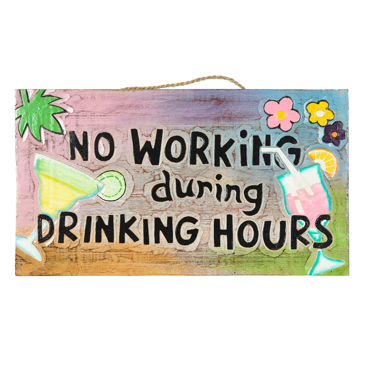 Hand carved and hand-painted wooden ‘No working during drinking hours’ sign.