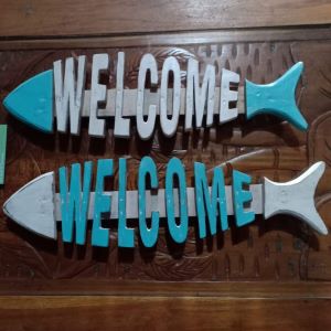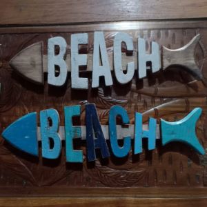 Fish shape wooden beach sign. Dimensions; W45 x H12cm.